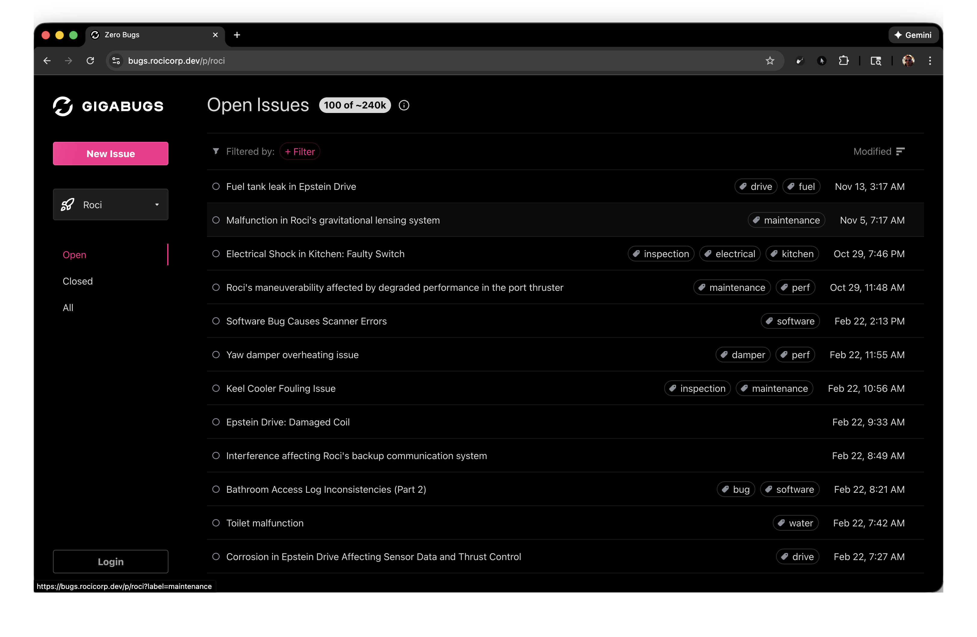 A complete Linear-style bug tracker, populated with 1.2 million bugs, totalling over 1GB of sample data.
